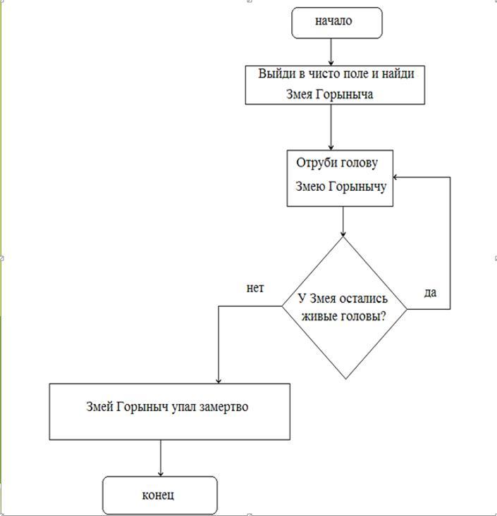 Угадайте, какое литературное произведение зашифровано в следующей блок-схеме. Назовите форму записи алгоритма. Почему?