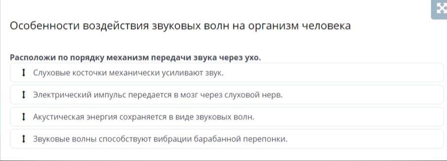 Расположи по порядку механизм передачи звука через ухо.