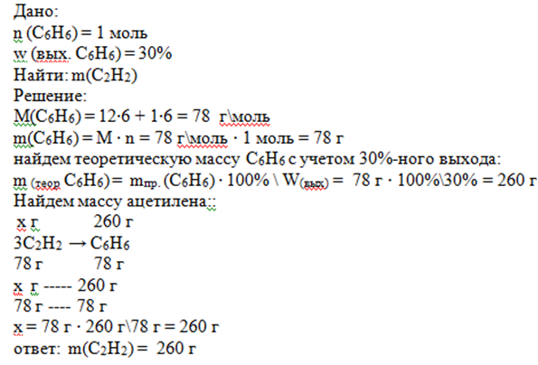 Какую массу ацетилена следует взять для получения бензола количеством вещества 1 моль, если массовая доля выхода составляет 30%.