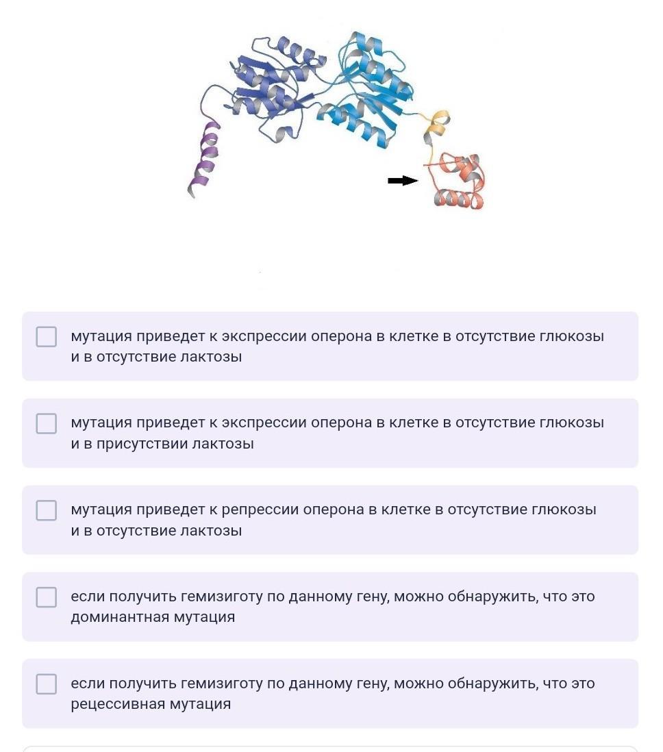 На рисунке изображено строение белка lac-репрессора. Стрелкой обозначен домен с характерным для ДНК-узнающих белков мотивом «спираль-поворот-спираль». В этом домене произошла мутация, существенно затрагивающая его структуру. Выберите верные утверждения.