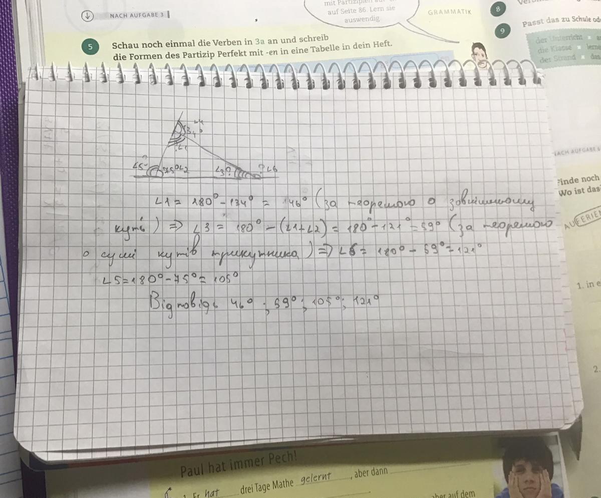 Зовнішній кут трикутника дорівнює 134°, а один із несуміжніх із ним внутрішніх кутів дорівнює 75°. Знайдіть усі внутрішні й невідомі зовнішні кути трикутника