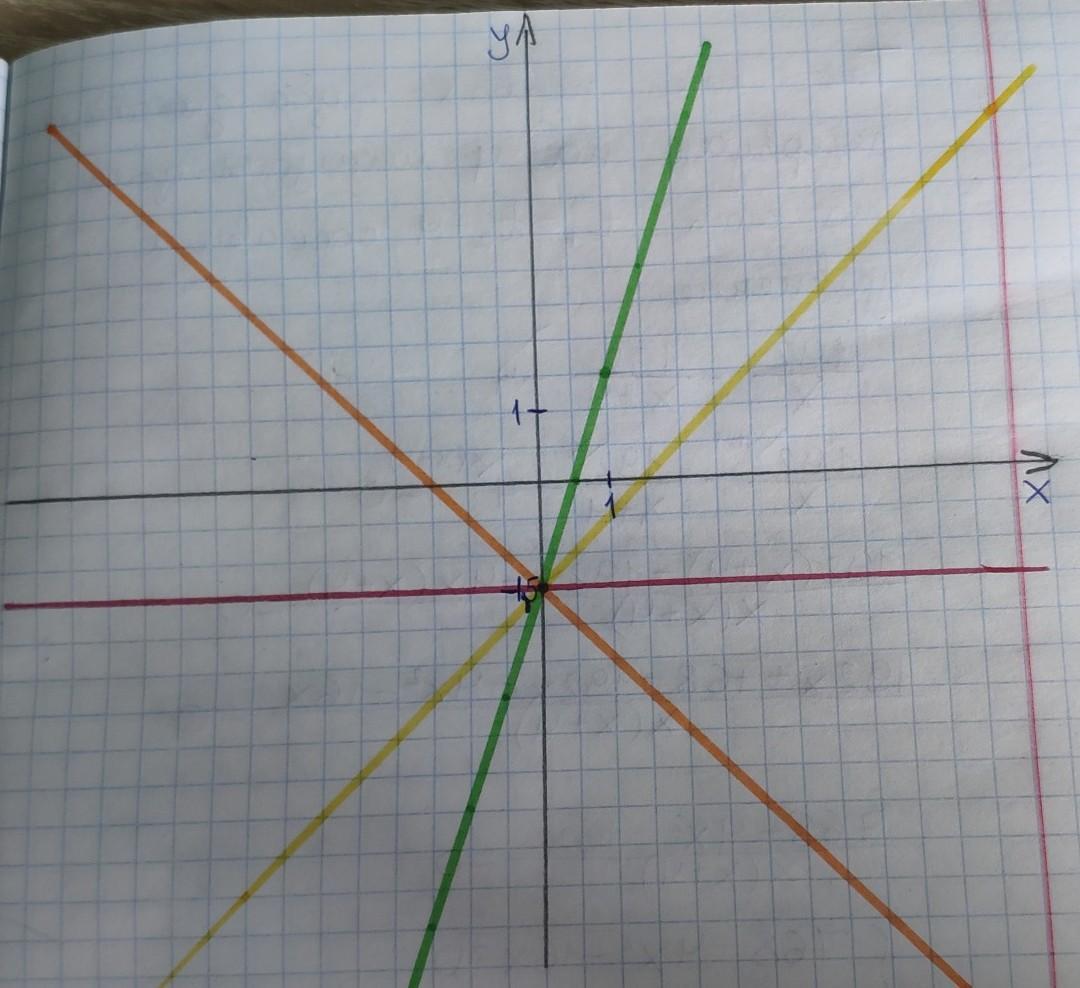 Все прямые проходят через точку (0;–1,5) так как коэффициент b (формула у=kx+b) во всех функциях одинаковый. Этот коэффициент равен значению кординаты у, если х=0.