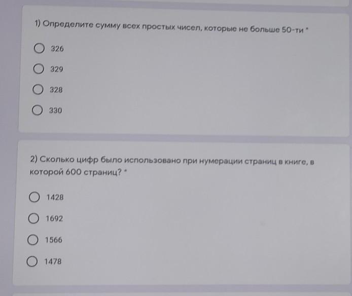 1) 2 + 3 + 5 + 7+ 11 + 13 + 17 + 19 + 23 + 29 + 31 + 37 + 41 + 43 + 47 = 328