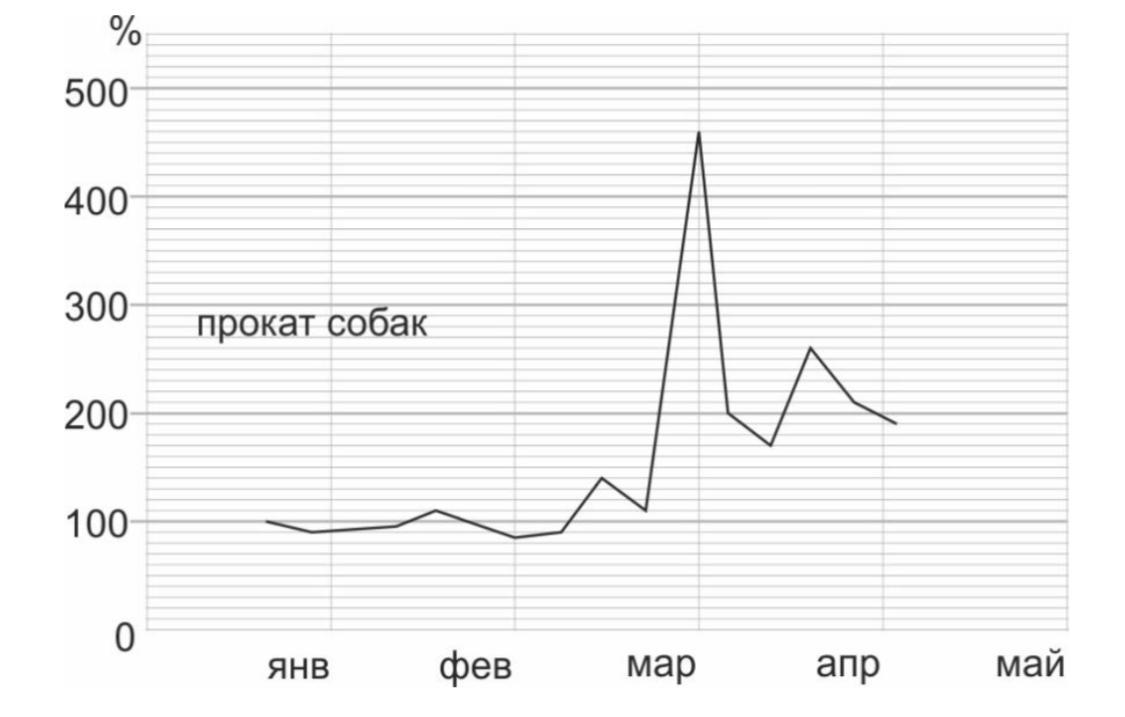 Сервис публикует результаты статистических исследований о том, как изменилась жизнь людей в России во время самоизоляции, связанной с коронавирусом. Вот, например, как менялось количество поисковых запросов по ключевым словам «Прокат собак». Показано изменение числа запросов по сравнению с третьей неделей января. На сколько процентов максимальное число запросов превышает начальное значение?
