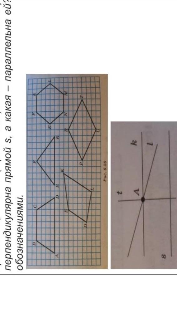 № 1062. Через точку А, не лежащую на прямой s, проведены прямые k, l и t ( рис. 6.37). Какая из этих прямых: k, l и t перпендикулярна прямой s, а какая – параллельна ей? Запишите их с обозначениями.