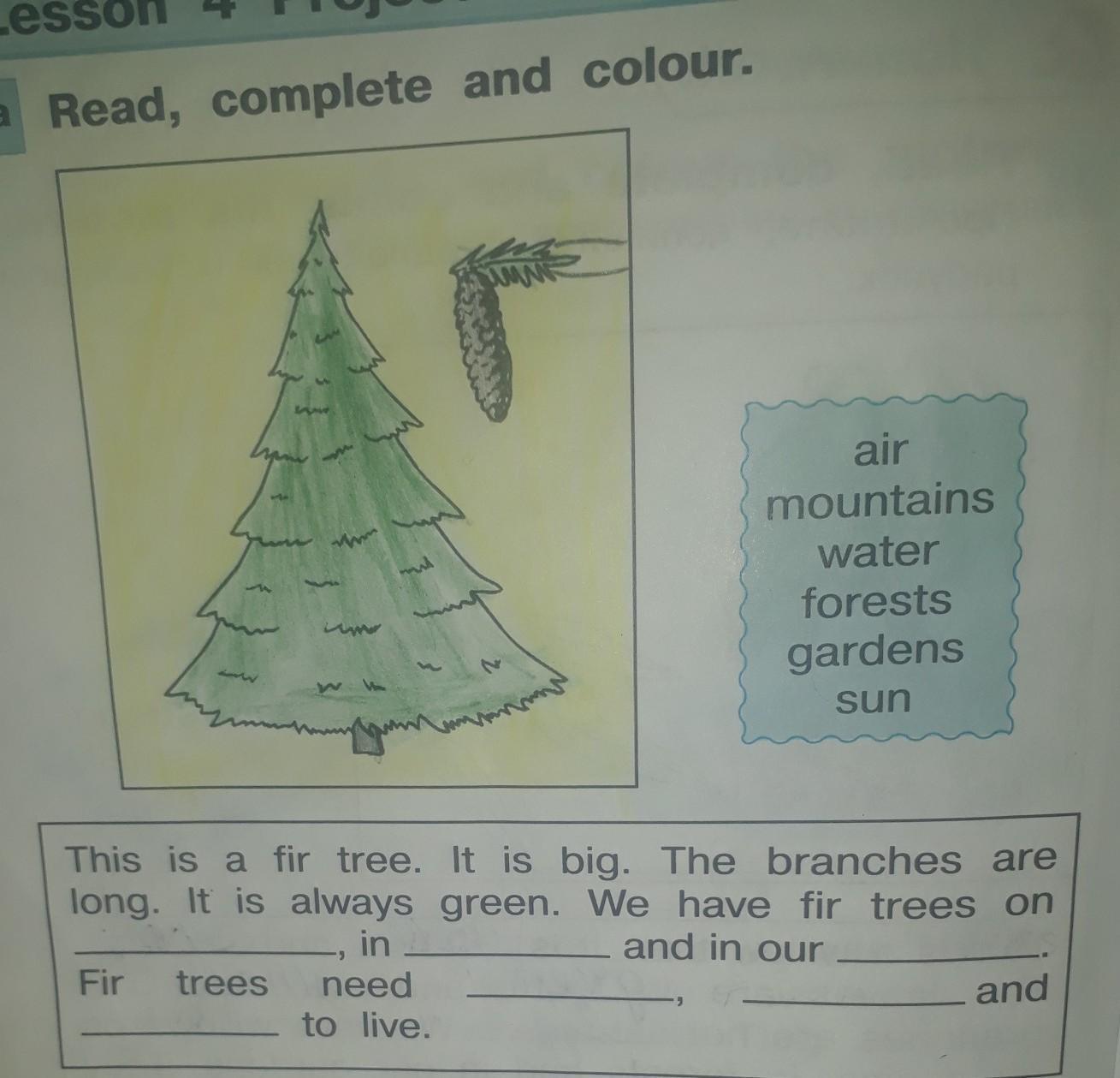 This is a fir tree.It is big.The branches are long.It is always green.We have fir trees on mountains,in forests and in our gardens.Fir trees need air,water and sun to live.
