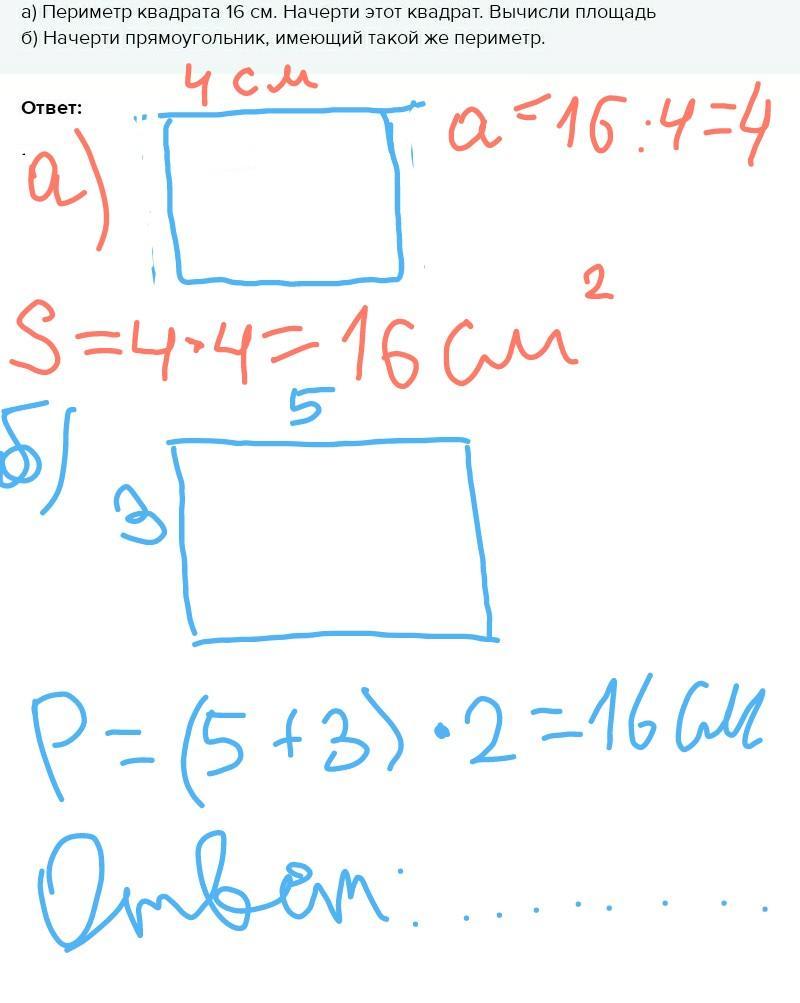а) Периметр квадрата 16 см. Начерти этот квадрат. Вычисли площадь