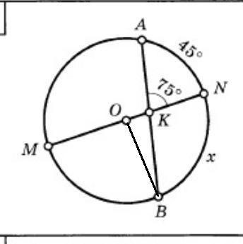 Проведём радиус OB. Тогда центральный угол <MOB=105°. Значит смежный с ним <NOB=180-105=75°. Но <NOB - центральный угол, опирающийся на дугу NB, значит х=75°