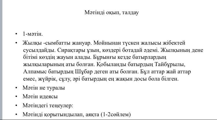 2. Мәтіннің идеясы жылқы малын сипаттау.