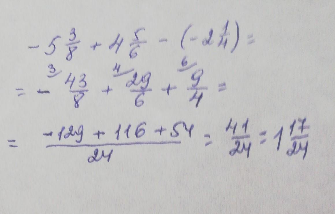 -5 3/8+4 5/6-(-2 1/4) = -43/8+29/6-(-9/4)=-43/8+29/6+9/4=41/24