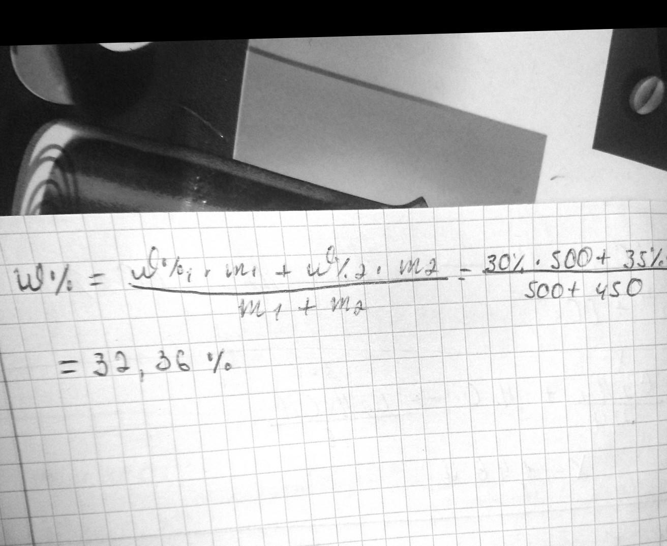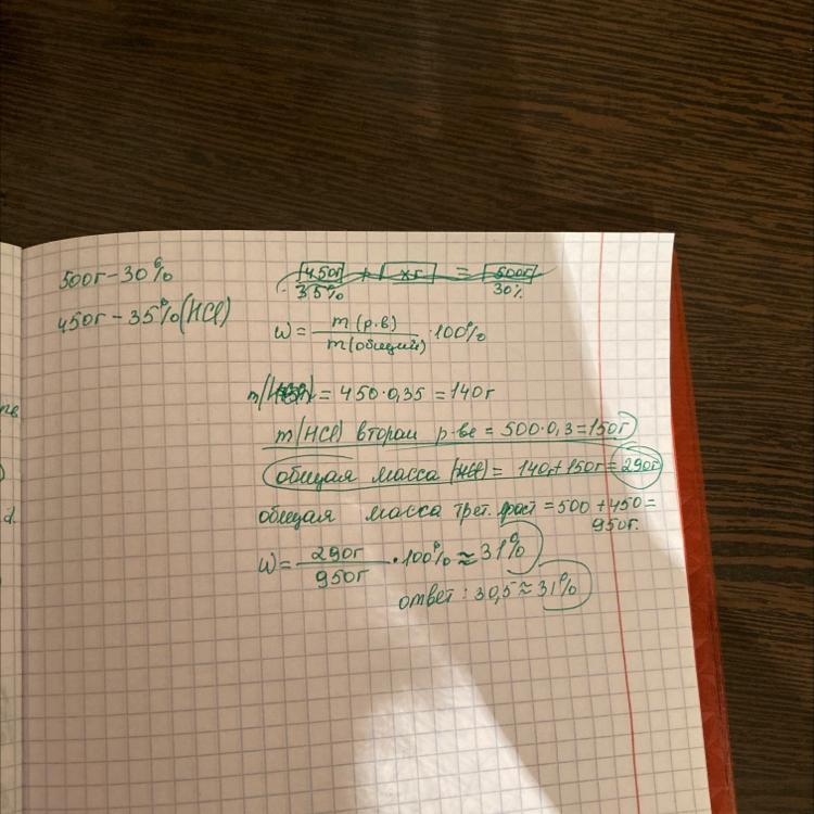 Вычисли массовую долю (в %) растворенного вещества раствора , получившегося при сливании 500г 30% и 450 г 35% растворов соляной кислоты.