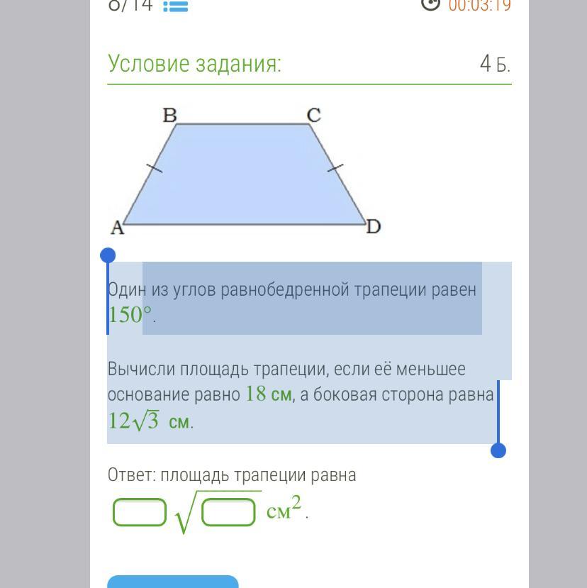 Вычисли площадь трапеции, если её меньшее основание равно 18 см, а боковая сторона равна 12√ 3см.