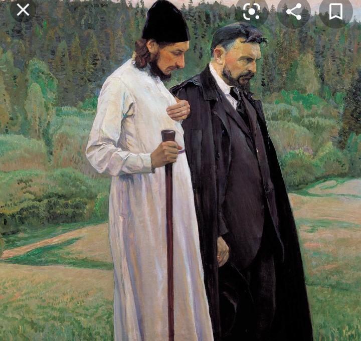 Это жевописная картина на которой Фильмов Нестеров идёт с человеком в белой одежде