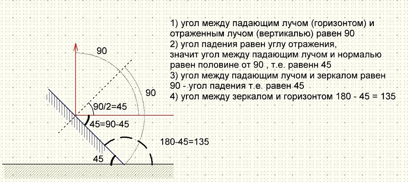 Луч света скользит вдоль поверхности земли. Под каким углом к горизонту надо расположить плоское зеркало, чтобы лучи, отразившись от него, пошли вертикально вверх. Показать на чертеже