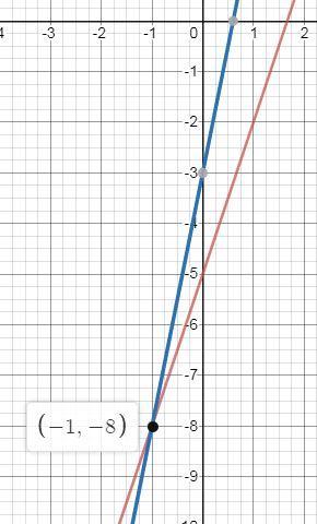 Побудуй графіки лінійних функцій y=3x−5 і y=5x−3 в одній координатній площині та розв'яжи рівняння 3x−5=5x−3, використовуючи побудову.