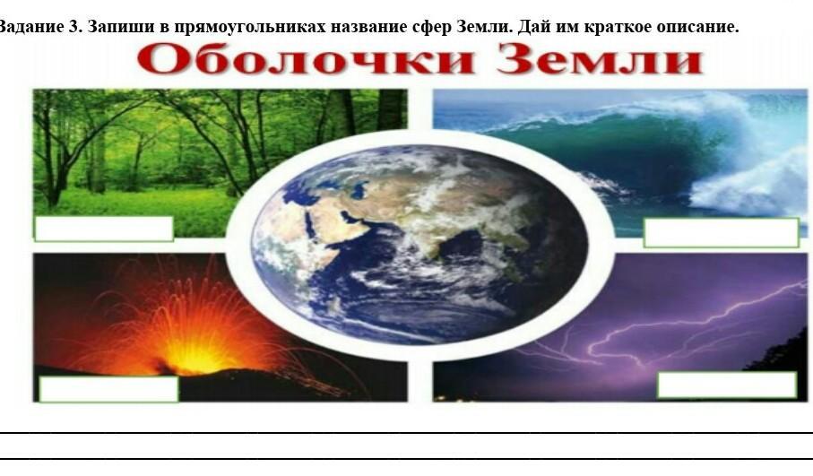 Задание 3. Запиши в прямоугольниках название сфер Земли. Дай им краткое описание.