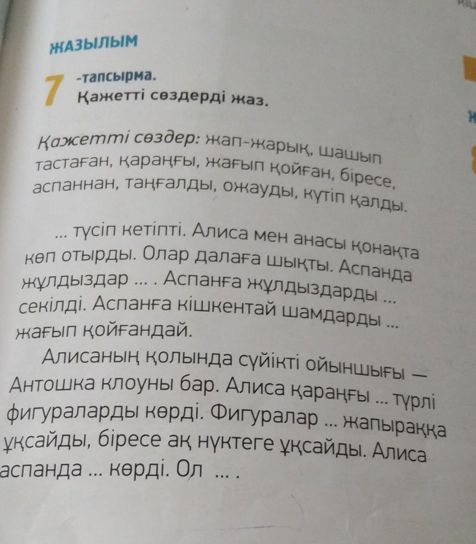 Қараңғы түсіп кетіпті.Алиса мен анасы қонақта кеп отырады.Олар далаға шықты.Аспанда жұлдыздар жап-жарық.Аспанға жұлдыздарды жағып қойған секілді.Аспанға кішкентай шамдарды шашып тастағандай,жағып койғандай.Алисаның қолына сүйікті ойыншығы Антошка клоуны бар.Алиса қараңғы әр түрлі ожауды түрлі фигураны корді.Фигуралар біресе жапырақа ұқсайды.біресе ақ нуктеге ұқсайды.Алиса аспанда ожауды көрді.Ол таң қалды.