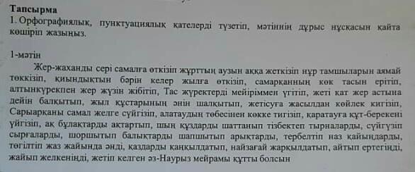 1. Орфографиялық, пунктуациялық қателерді түзетіп, мəтіннің дұрыс нұсқасын қайта жазыңыз
