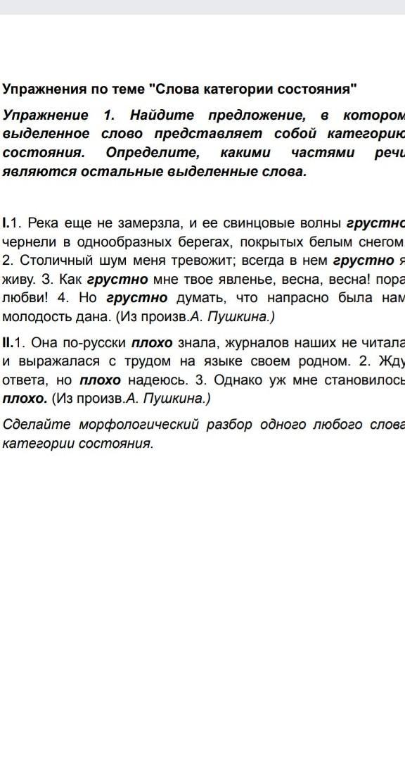 Упражнения по теме "Слова категории состояния" Упражнение 1. Найдите предложение, в котором выделенное слово представляет собой категорию состояния. Определите, какими частями речи являются остальные выделенные слова. 1.1. Река еще не замерзла, и ее свинцовые волны грустно чернели в однообразных берегах, покрытых белым снегом. 2. Столичный шум меня тревожит; всегда в нем грустно я живу. 3. Как грустно мне твое явленье, весна, весна! пора любви! 4. Но грустно думать, что напрасно была нам молодость дана. (Из произв.А. Пушкина.) IП.1. Она по-русски плохо знала, журналов наших не читала и выражалася с трудом на языке своем родном. 2. Жду ответа, но плохо надеюсь. 3. Однако уж мне становилось плохо. (Из произв.А. Пушкина.) Сделайте морфологический разбор одного любого слова категории состояни