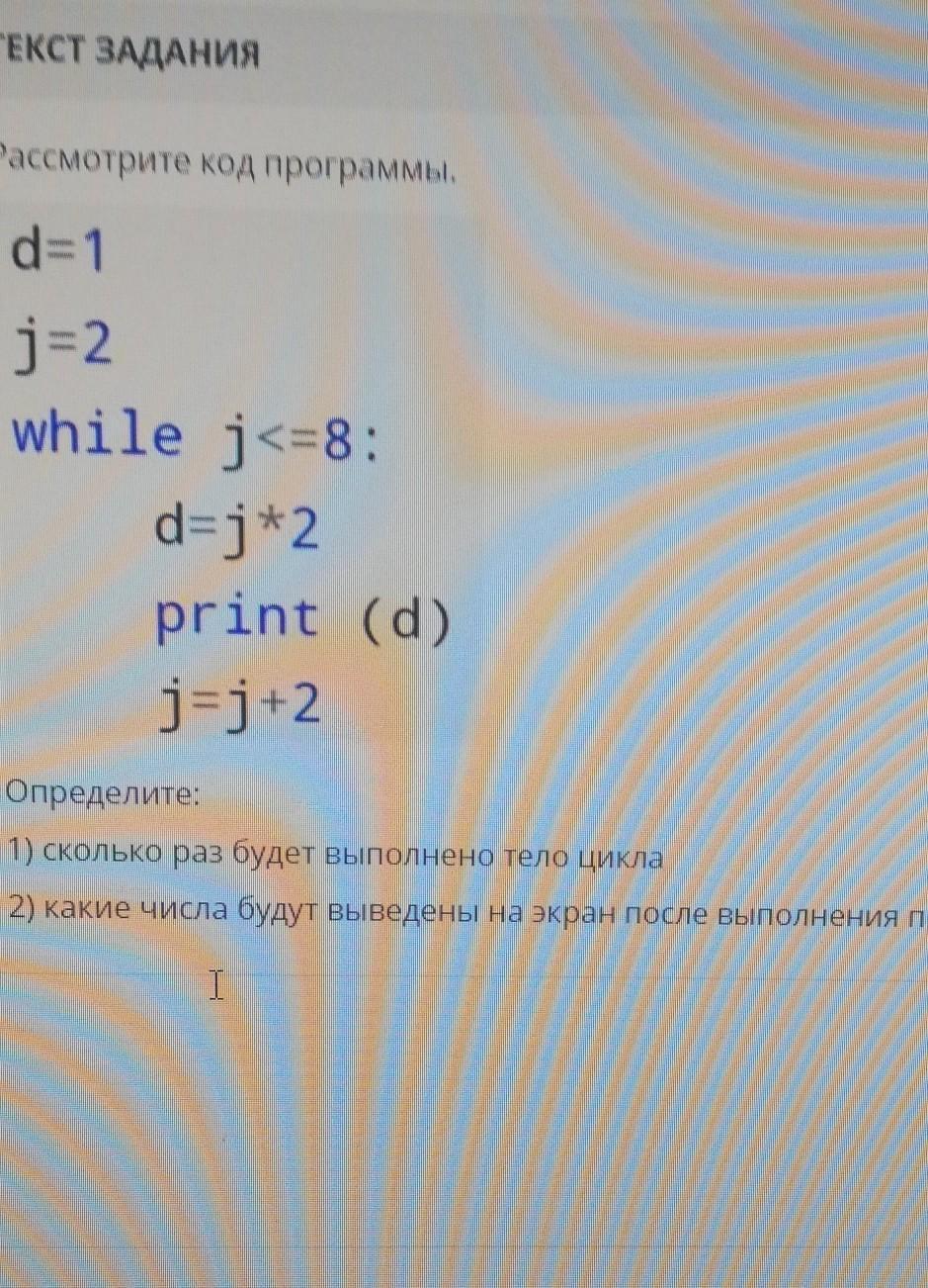 Помогите решить. 1)сколько раз будет выполнено тело цикла 2) какие числа будут выведены на экран после выполнения программы