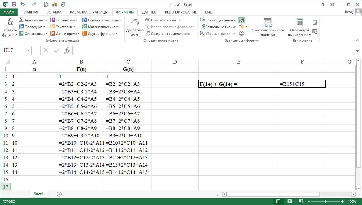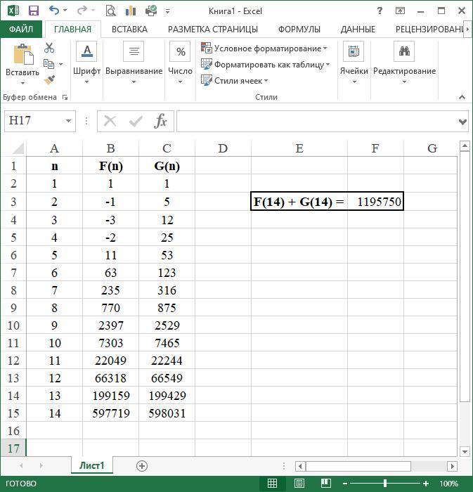Помогите написать программу в Excel. Алгоритм вычисления функций F(n) и G(n) задан следующими соотношениями: