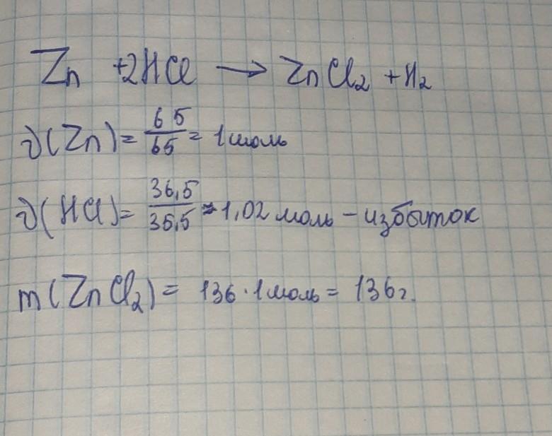 на цинк масссой 65 г подействовали раствор массой 36,5 г солянной кислоты. Расщитайте массу полученной соли