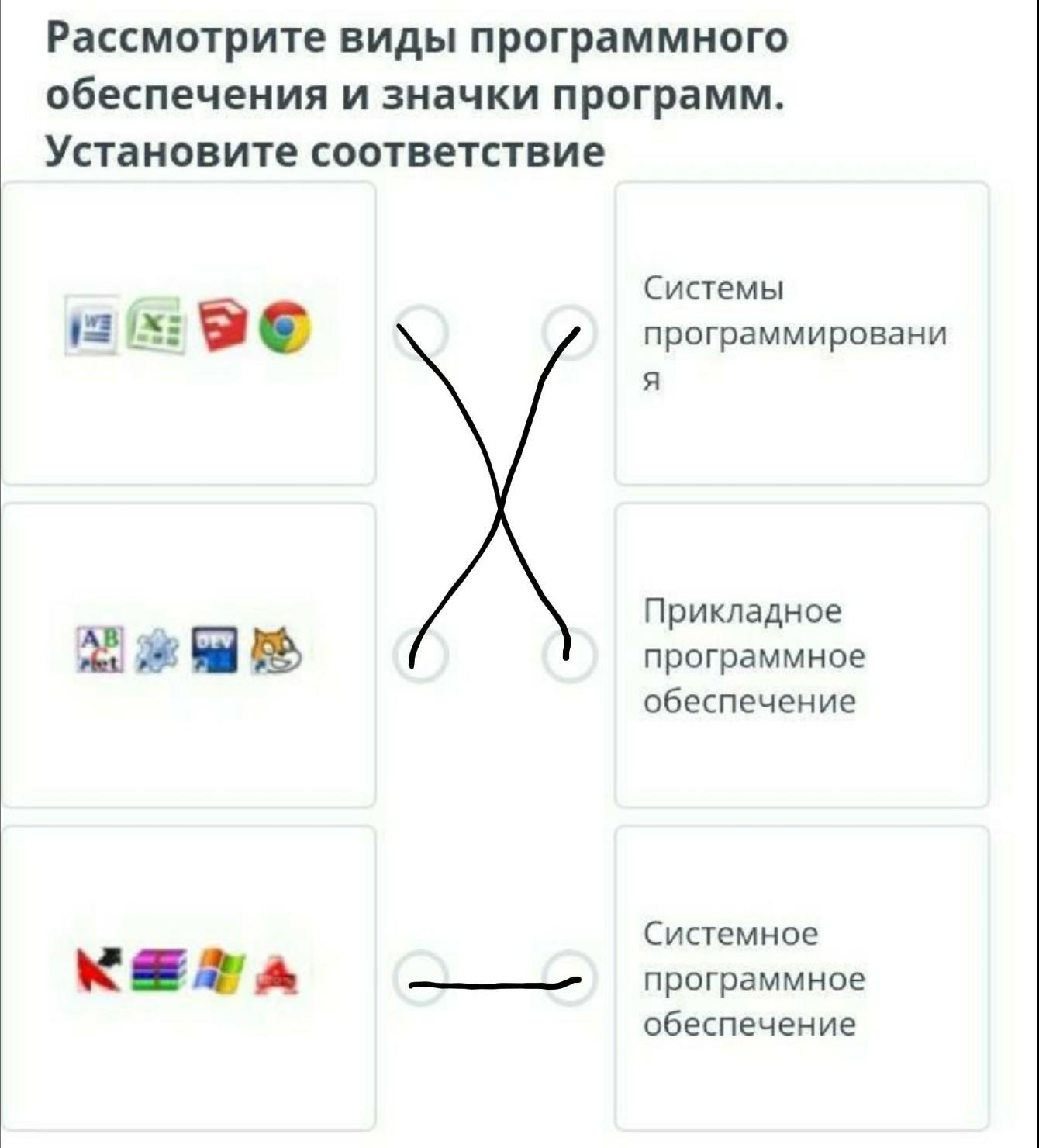 помогите сор Рассмотрите виды программного обеспечения и значки программ. установите соответствие системы программировани я прикладное программное обеспечение системное программное обеспечение