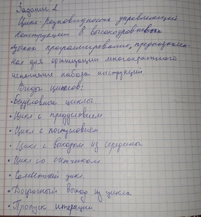 А вот Досрочный выход из цикла и Пропуск итерации вообще к видам циклов ни каким боком... И того из перечисленных видов реальны только Цикл с предусловием, цикл с постусловием, цикл со счетчиком, совместный цикл, остальные это производные от этих 4-х, но уж как дал вам это ваш учитель пусть оно так и будет...
