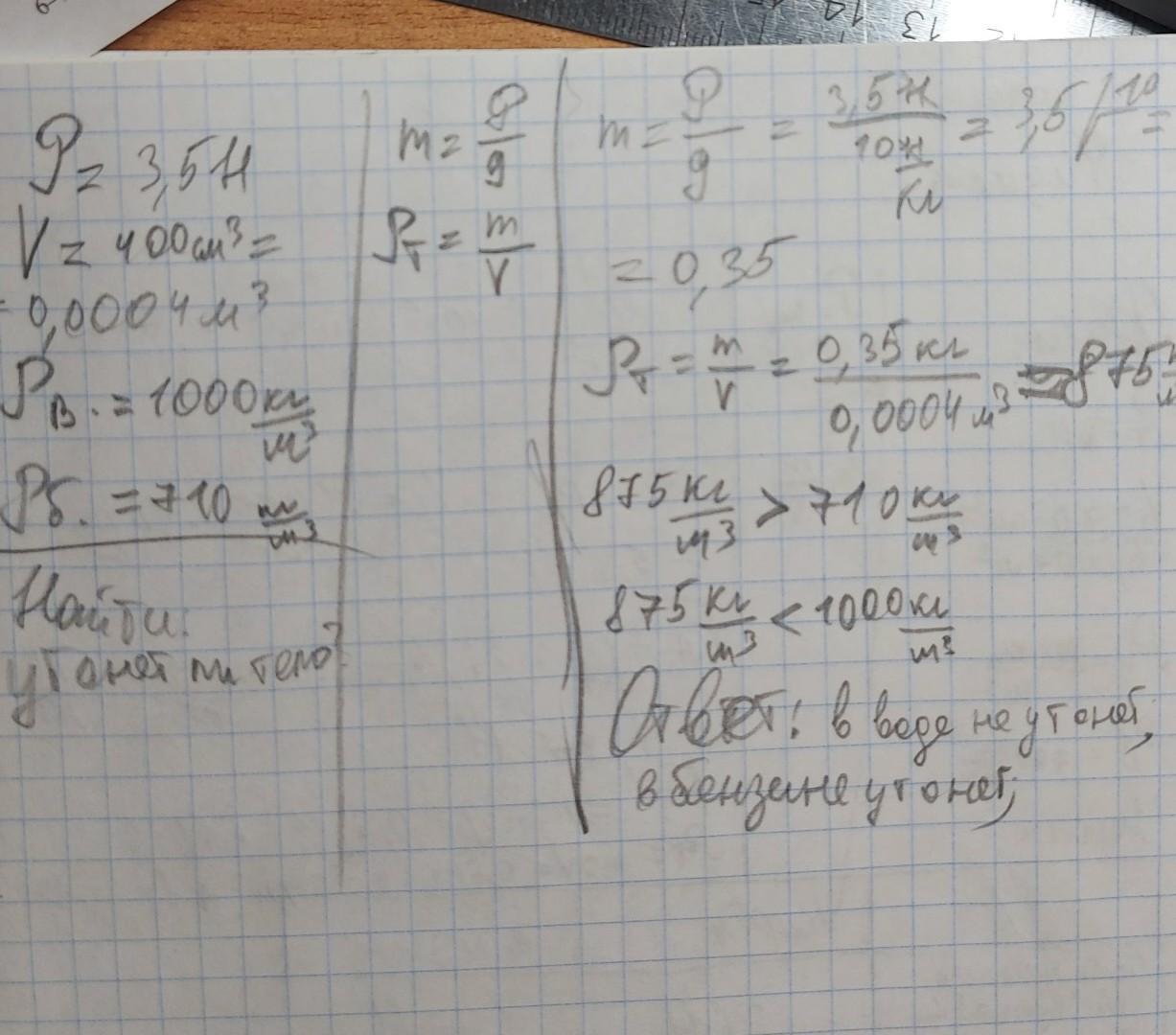 Вес тела 3,5 Н, а его объем 400 см3. Утонет ли это тело в воде? В бензине?