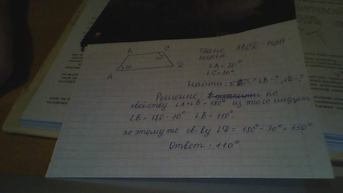 В трапеции АВСD угол А=70 угол С=30.Найдите наименьший из углов В и D.в ответе укажите ее градусную меру.