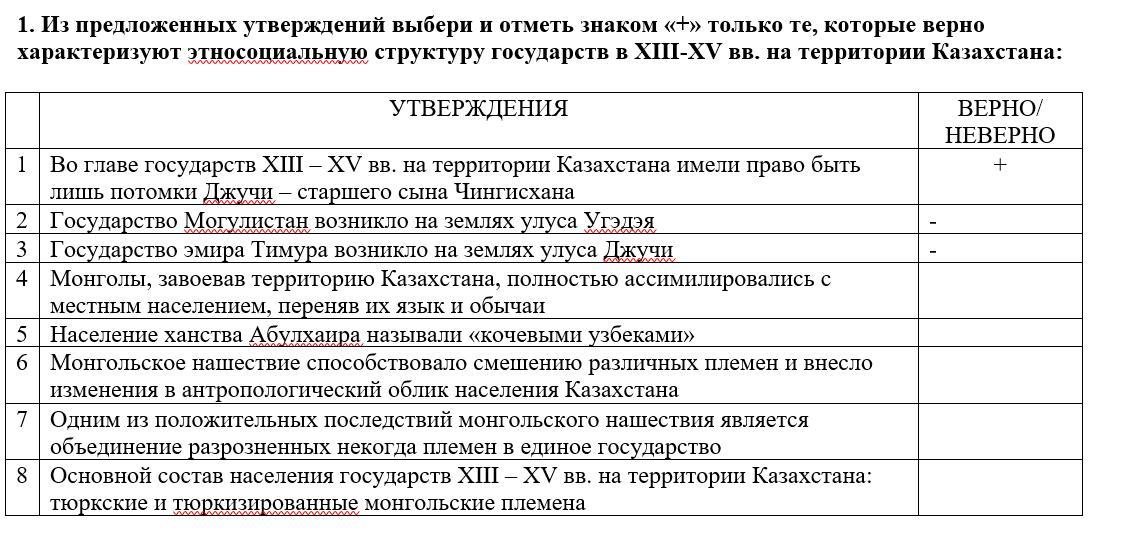Из предложенных утверждений выбери и отметь знаком «+» только те, которые верно характеризуют этносоциальную структуру государств в XIII-XV вв. на территории Казахстана:
