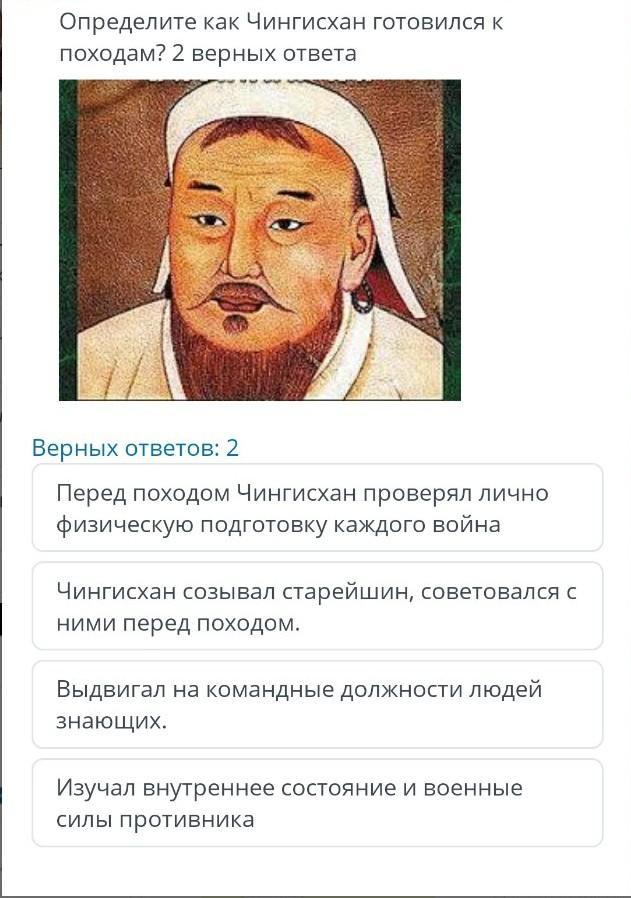 Определите как Чингизхан готовился к походам? 2 верных ответа. Пожалуйста помогите!!