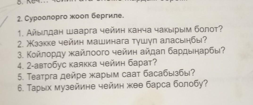 2. Сұрақтарға жауап беріңіз. 1. Ауылдан қалаға дейін қанша шақырым жерде? 2. Көлікпен жағажайға жете аласыз ба? 3. Сіз қойларды жайылымға айдадыңыз ба? 4.2 автобус қанша жол жүреді? 5. Театрға жарты сағат жаяу барамыз ба? 6. Тарих мұражайына жаяу баруға бола ма?(я не кыргыз но вот)