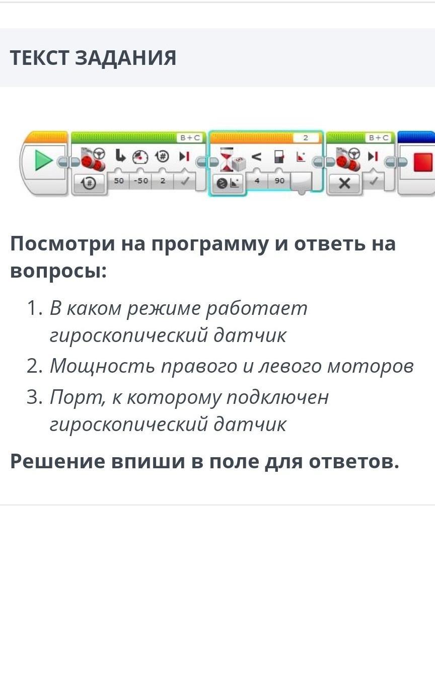 ТЕКСТ ЗАДАНИЯ Посмотри на программу и ответь на вопросы: 1. В каком режиме работает гироскопический датчик 2. Мощность правого и левого моторов 3. Порт, к которому подключен гироскопический датчик Решение впиши в поле для ответов.Помогите умоляю