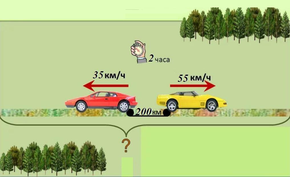 задача сделать чертёж из двух городов расстояние между которыми 200 километров одновременно в противоположном направлении выехали два автомобиля скорость одного 55 км ч другой 35 км ч какое расстояние будет между ними через 2 часа