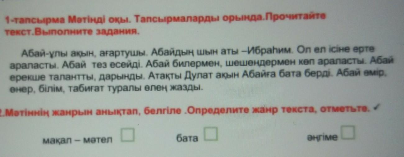 • Мәтіннің жанрын анықтап, белгіле((V) ).