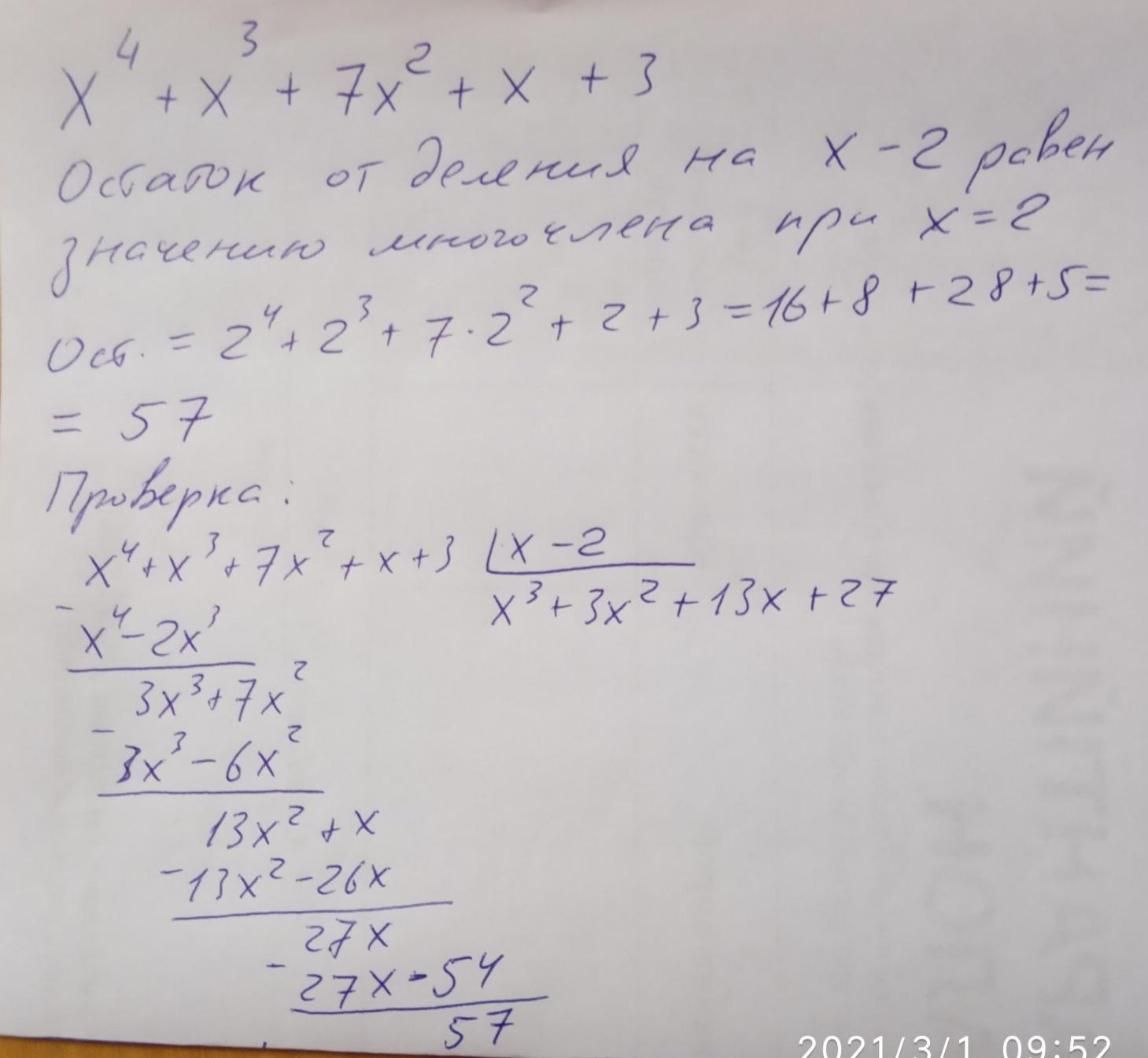 Не выполняя деления, найти остаток от деления многочлена (используйте теорему Безу)