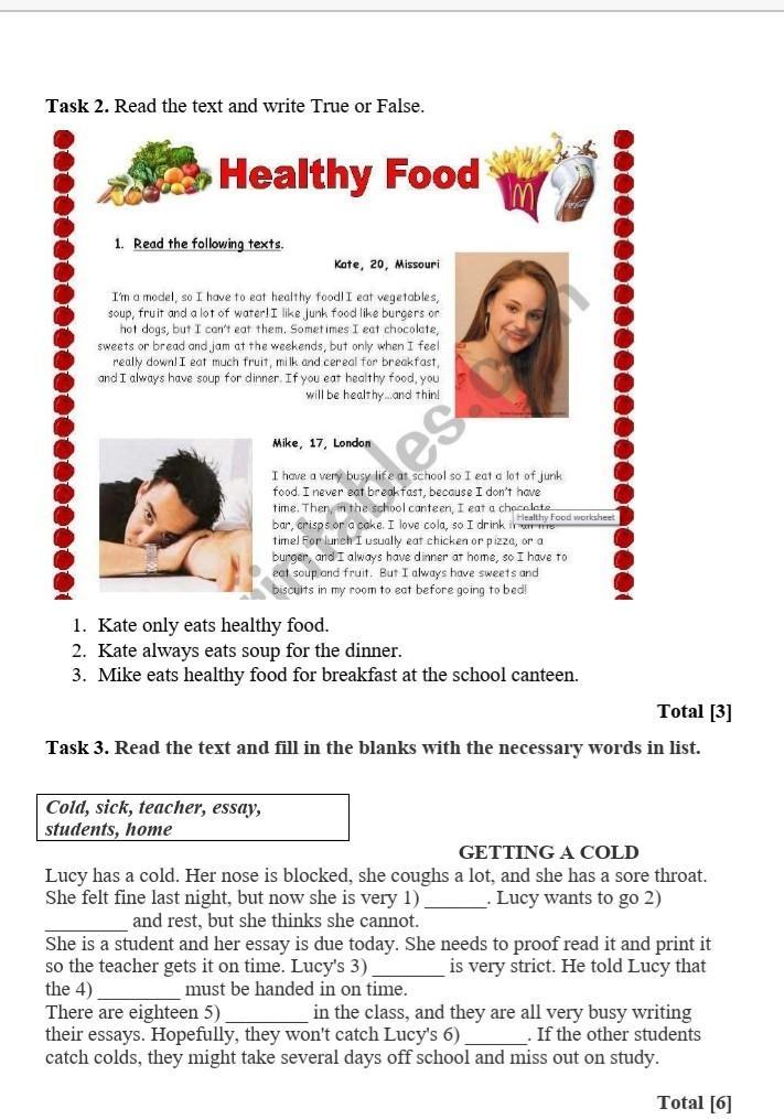 1) sick; 2) home; 3) teacher; 4) essay; 5) students; 6) cold
