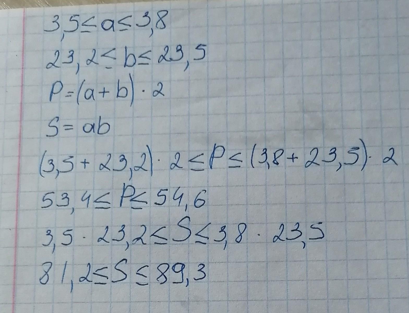 Оцените периметр и площадь прямоугольника со сторонами а см и bсм,где3,5 ≤a≤ 3,8, 23,2 ≤b≤ 23,5