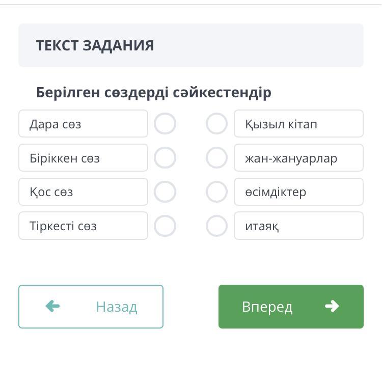Берілген сөздерді сәйкестендір Дара сөз Қызыл кітап Біріккен сөз жан - жануарлар Қос сөз өсімдіктер Тіркесті сөз Итаяқ