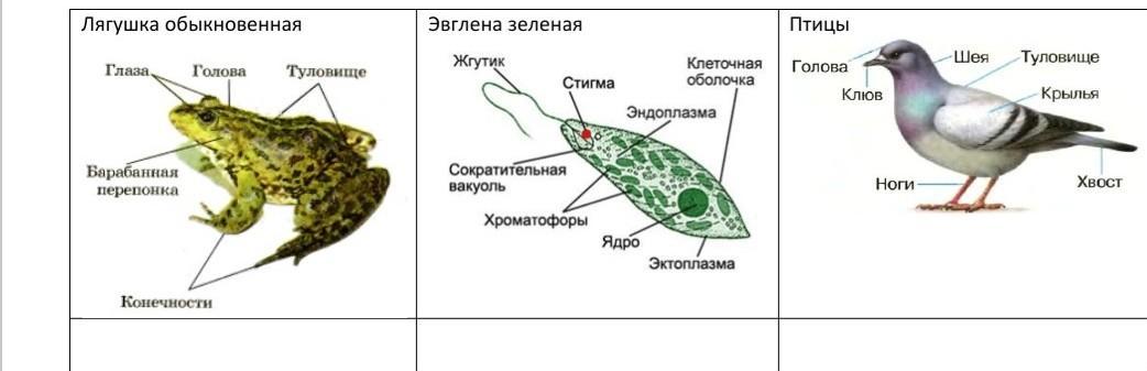 Написано на фото Взрослая лягушка - конечности, Эвглена-Шольт, Для птиц - крылья и ноги