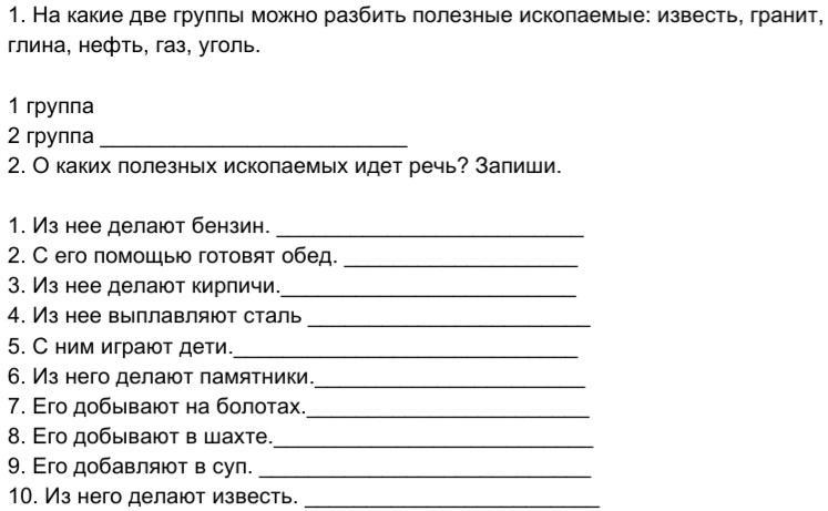 1. На какие две группы можно разбить полезные ископаемые: известь, гранит, глина, нефть, газ, уголь.