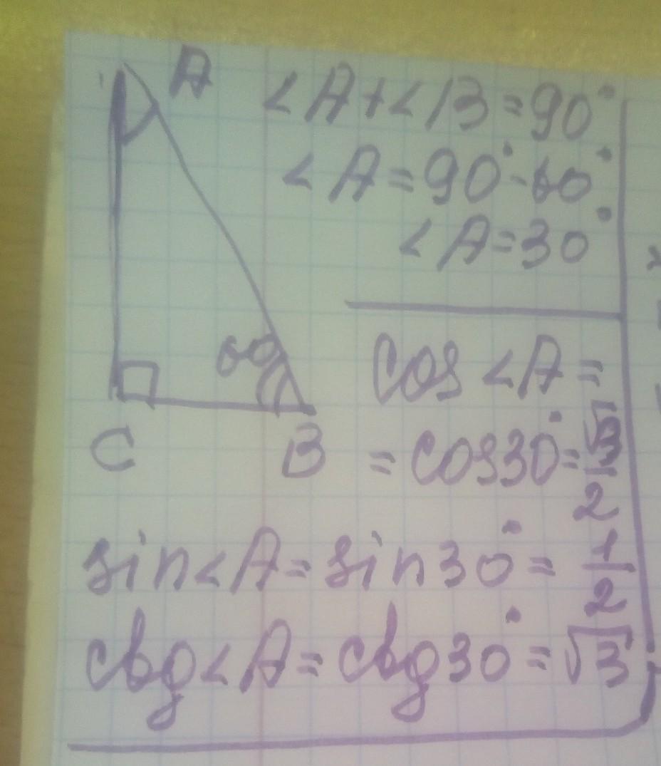 Треугольник ABC, угол C = 90 градусов, Угол B 60 градусов . Вычислить: cos угла A: b) sin угла A: c) ctg угла A