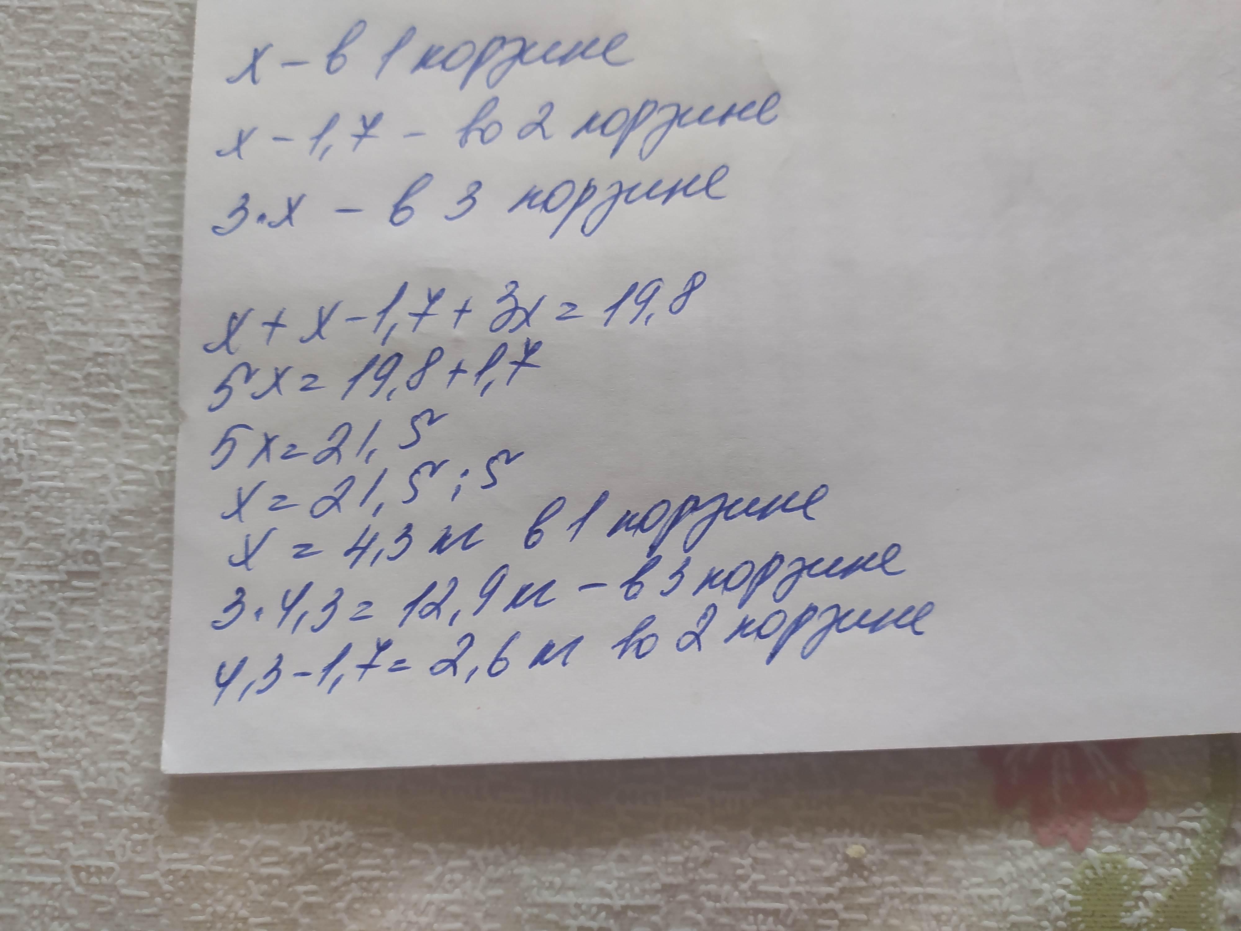 В трех корзинах 19,8 кг яблок. Во второй корзине на 1,7 кг яблок меньше, чем в первой, а в третьей в 3 раза больше, чем в первой корзине. Какова вместимость большей корзины?