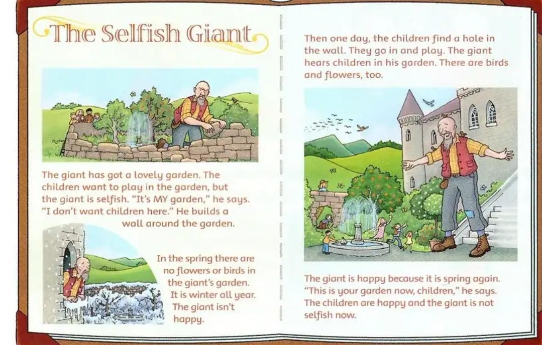 У великана есть прекрасный 1) сад. Дети хотят играть в саду, но великан эгоистичен. «Это мой сад», — говорит он. «Я не хочу, чтобы дети были здесь». Он строит 2) стену вокруг сада.