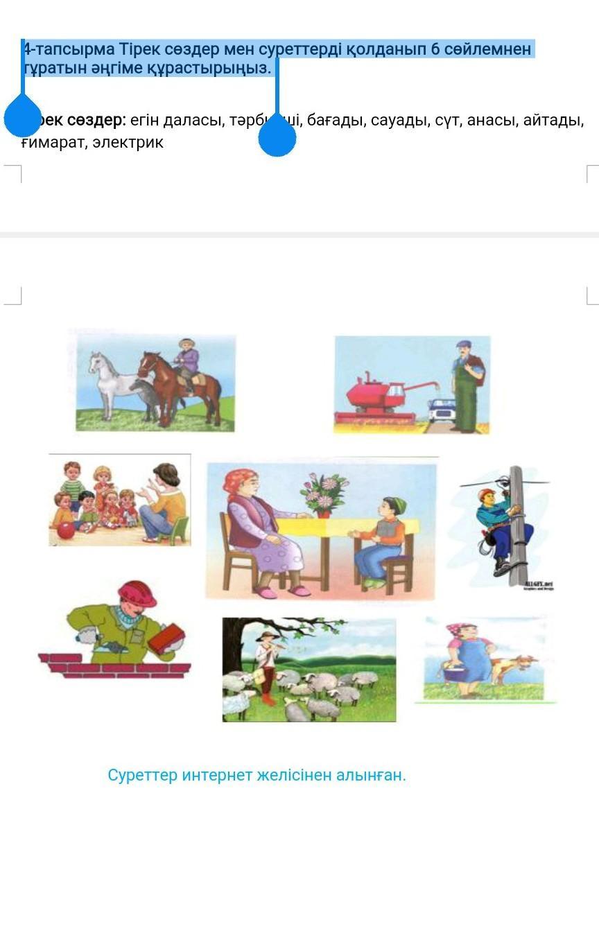 4-тапсырма Тірек сөздер мен суреттерді қолданып 6 сөйлемнен тұратын әңгіме құрастырыңыз.