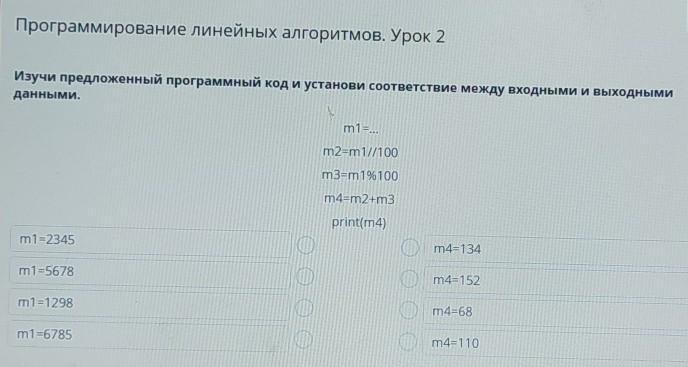Изучи предложенный программный код и установи соответствие между входными и выходными