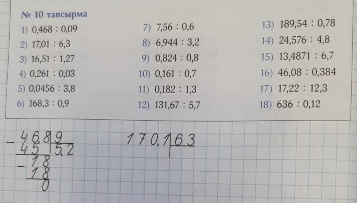 1 ) 0,468 : 0,09 2 ) 17,01 : 6,3 3 ) 16,51 : 1,27 4 ) 0,261 : 0,03 5 ) 0,0456 : 3,8 ) 168,3 : 0,9 7 ) 7,56 : 0,6 8 ) 6,944 : 3,2 9 ) 0,824 : 0,8 10 ) 0,161 : 0,7 11 ) 0,182 : 1,3 12 ) 131,67 : 5,7 13 ) 189,54 : 0,78 14 ) 24,576 : 4,8 15 ) 13,4871 : 6,7 16 ) 46,08 : 0,384 17 ) 17,22 : 12,3 18 ) 636 : 0,12