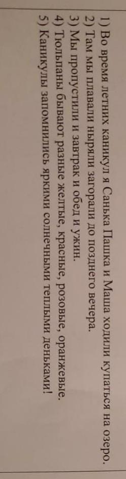 расставьте знаки препинания в предложениях с однородными членами пять минут во время летних каникулов я Саня Пашка и Машка ходили купаться на озеро срочно