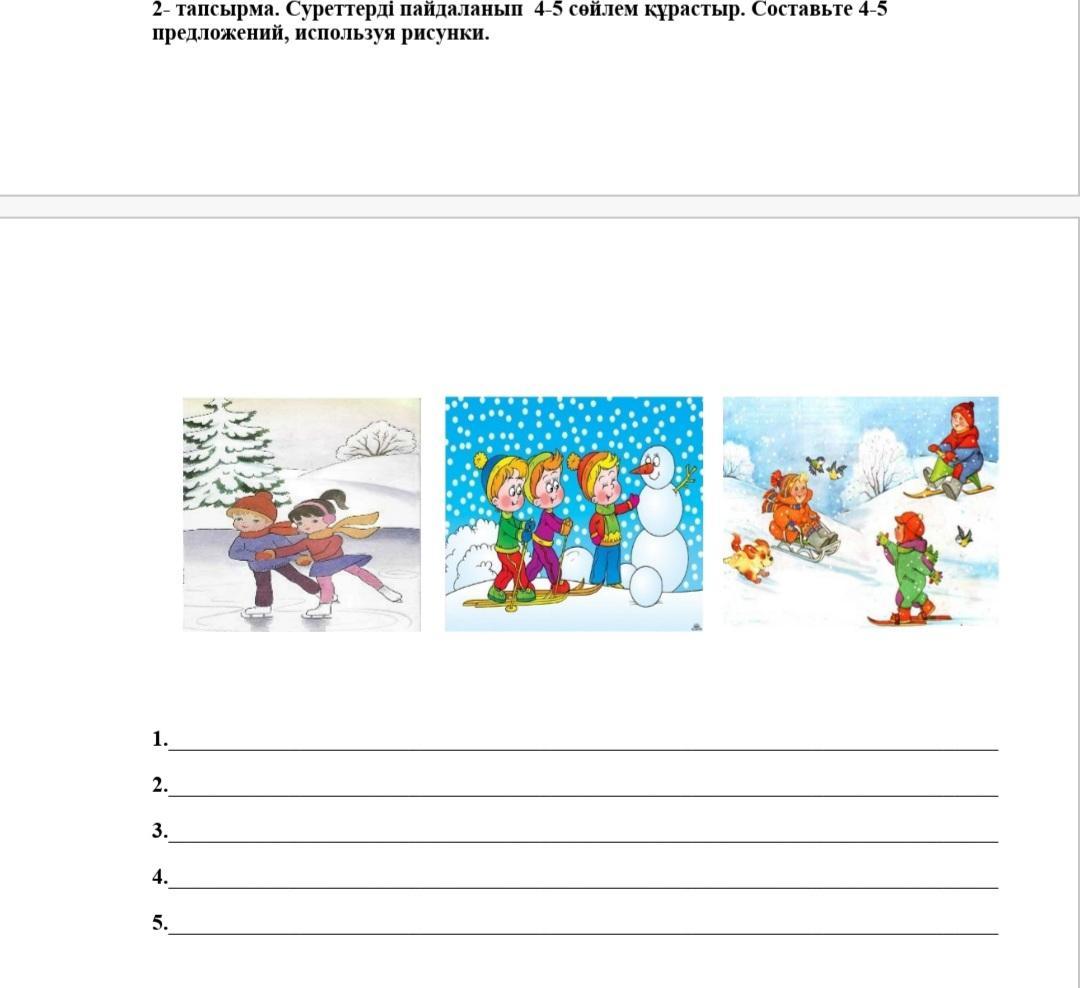 2.балалар қармен ойнауға, бір-біріне қар бүршіктерін лақтыруға, аққала жасауға, шанамен сырғанауға, мұз үстінде сырғанауға көңілді.